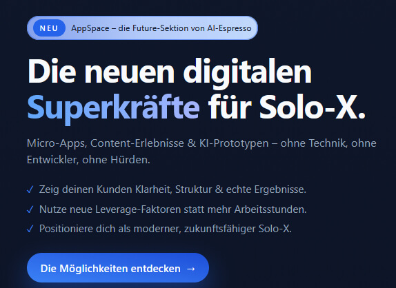 AppSpace gibt dir genau diese Hebel. Nicht als komplizierte Technologie. Sondern als einfache Möglichkeiten, die Solo-X 2026 nutzen können, um digital richtig durchzustarten.